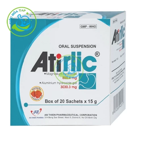 Atirlic với thành phần chính trong mỗi gói 10g gồm Magnesi hydroxyd 800mg; Nhôm hydroxyd (dưới dạng Nhôm hydroxyd gel khô) 800mg; Simethicon (dưới dạng Simethicon nhũ dịch 30%) 100mg cùng hàm lượng vừa đủ. Thuốc được dùng cho các đối tượng viêm loét dạ dày - tá tràng, trào ngược dạ dày - thực quản. Thuốc được sản xuất tại Việt Nam.