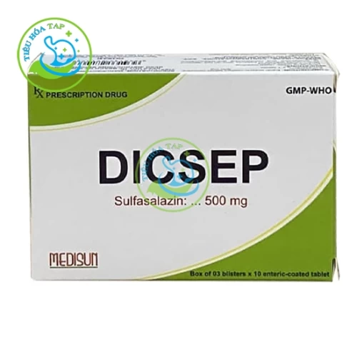 Dicsep là thuốc được dùng trong điều trị các bệnh nhân viêm loét đại tràng, chảy máu trực tràng, bệnh Crohn thể hoạt động. Thuốc được sản xuất từ thành phần Sulfasalazin với hàm lượng 500mg. Thuốc có số đăng kí là VD-31127-18, đây là thuốc của công ty cổ phần dược phẩm Me Di Sun.