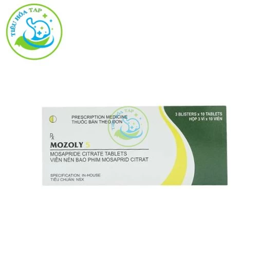 Mozoly 5 là thuốc có số đăng kí là VN-18501-14, là thuốc có thành phần chính Mosaprid citrat (dưới dạng Mosaprid citrat dihydrat) 5mg, dùng cho đối tượng bệnh nhân trưởng thành, được dùng trong điều trị các triệu chứng khó chịu ở đường tiêu hóa như nóng ruột, buồn nôn hay nôn mửa.